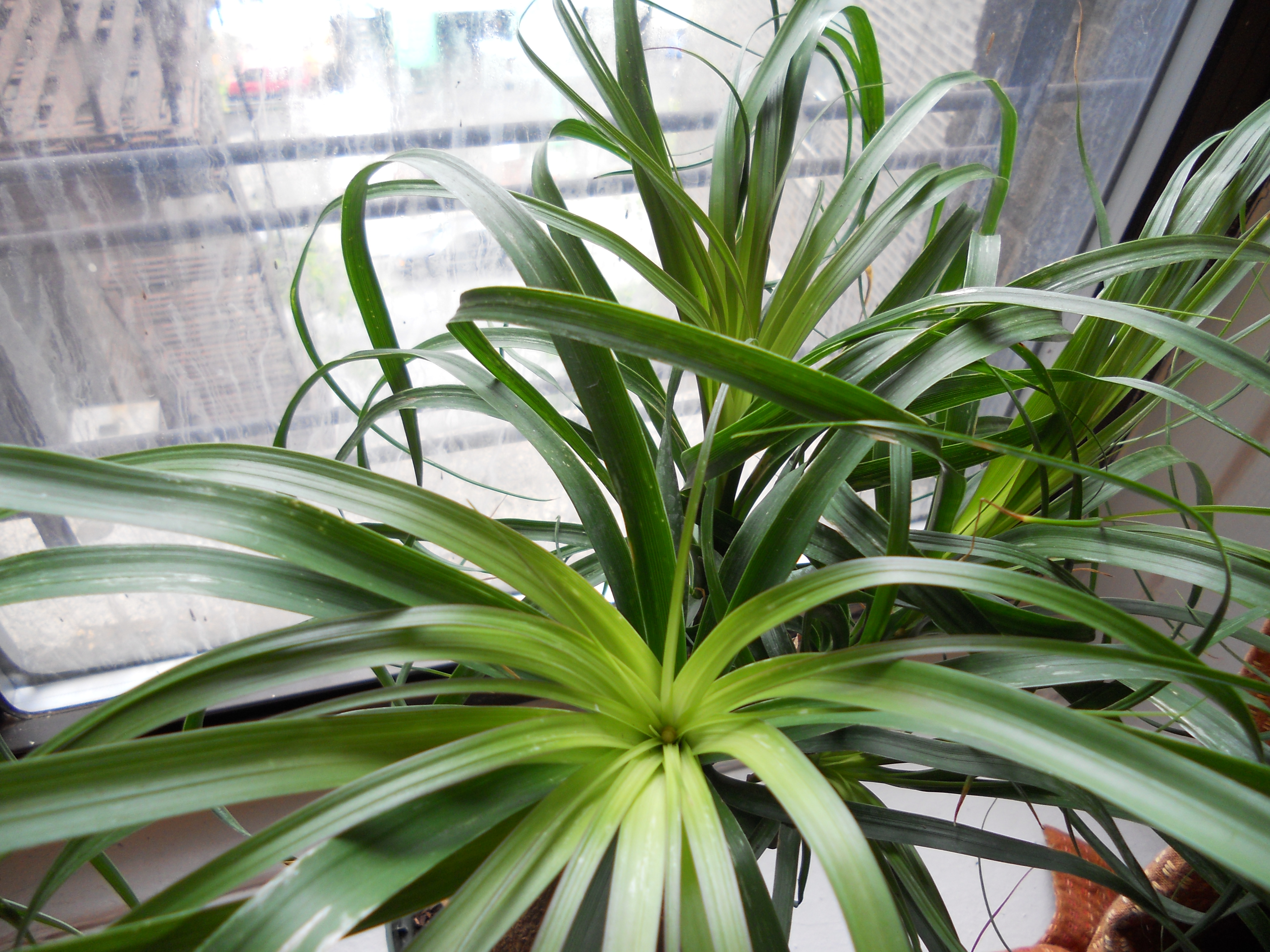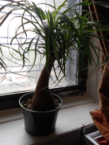 Recalling some article, somewhere, that said ficus aren’t the easiest, I told the man working there that I was looking for a houseplant that would be very hard to kill. He tried to point me toward the succulents, but I wasn’t falling into that old cactus trap again. I asked about the two I was eyeing, and he said the ponytail palm just needs to sit on a windowsill and be watered ever few weeks. Weeks! Sold.